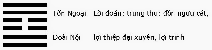 Văn Vương viết thoán từ: Trung Phu: Đồn ngư cát, lợi thiệp đại xuyên, lợi trinh (中孚: 豚魚吉, 利涉大川, 利貞).