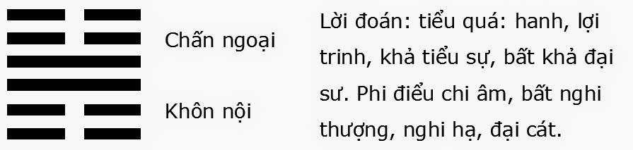 Tiểu quá có nghĩa là hơi quá độ, bất hòa hợp và rắc rối. Các hào thứ ba và thứ tư từ dưới đếm lên là các hào dương. Các hào còn lại là những hào âm. Lực dương không đóng ở ngôi vị làm chủ. Thêm nữa, nó đang bị bao vây bởi lực âm và không thể nào phát huy được trọn vẹn vai trò, vì vậy có hơi gặp khó khăn. Ầm tiêu biểu việc nhỏ và dương tiêu biểu cho việc lớn. Hào giữa, hào chủ tại mỗi đơn quái, là hào âm. Do đó, điều này có ý nói việc nhỏ không xong thì chẳng hy vọng gì hoàn thành được đại sự. Hình tượng của quẻ có dáng vẻ hai người đang ngồi đâu lưng vào nhau, do đó gợi ý sự bất hòa. Trong đoán quẻ, điều này ám chỉ rằng mọi việc sẽ không diễn ra suôn sẻ. Người ta cần giữ mình ở bên trong phạm vi, phận sự hay chuyên môn của mình, và đừng cố gắng bành trướng hay xông tới.